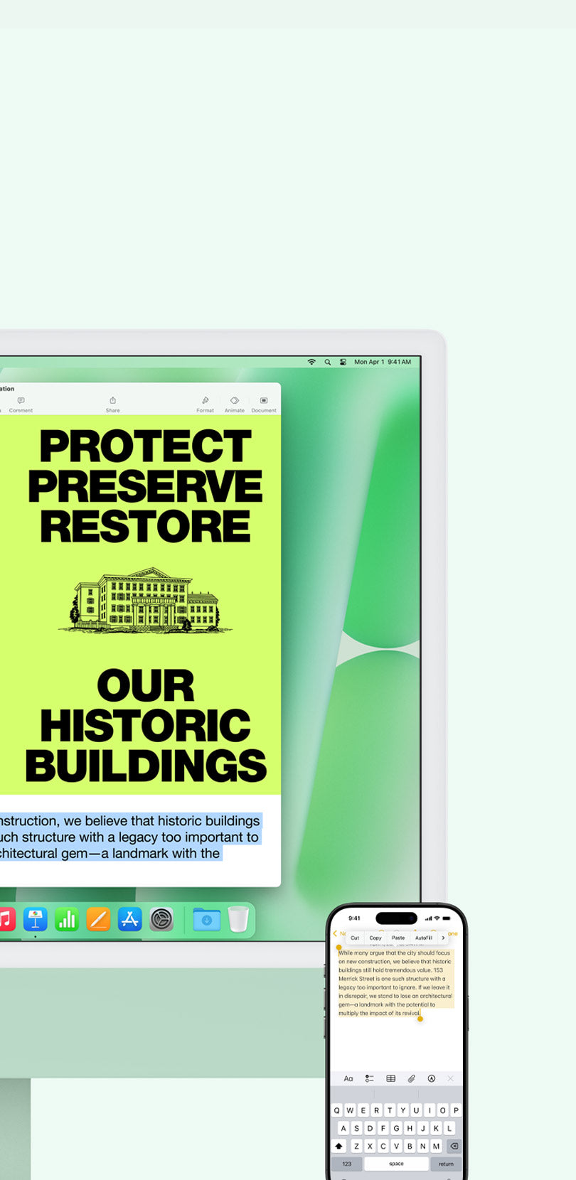 Répondez directement sur votre Mac aux appels et messages que vous recevez sur votre iPhone. Copiez des images, des vidéos ou du texte depuis votre iPhone, puis collez le tout dans une autre app sur votre Mac situé à proximité. Avec iCloud, accédez à vos fichiers préférés aussi bien de votre iPhone que de votre Mac. Et ce n’est pas tout.